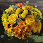 Ramo en tonos naranja, amarillo y verde, compuesto por lillium asiático, margaritas, gerberas, solidago y anastasias.