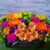 Centro de flores en caja de madera compuesto por margaritas en naranja y verde, solidago, gerberas, claveles, girasoles y statice.